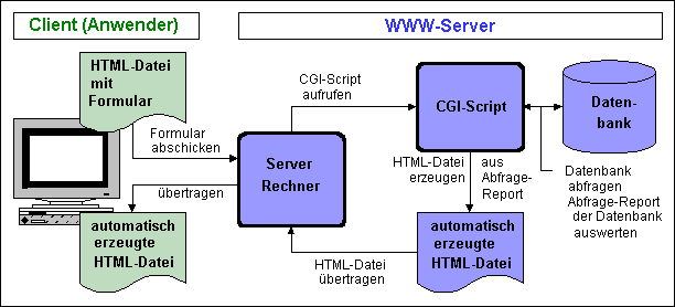 Das Common Gateway Interface (CGI) ist eine Schnittstelle um zwischen externen Applikationen (Client) und Informationsservern eine Verbindung für den Datenaustausch herzustellen. Ein normales HTML-Dokument, das auf einem Web-Server abgelegt wird ist statisch, das heißt, daß sich die Informationen dieses Dokumentes nicht verändern. Somit besteht die Gefahr, daß die im HTML-Dokument abgelegten Daten zur Zeit des Abrufes nicht mehr aktuell sind.